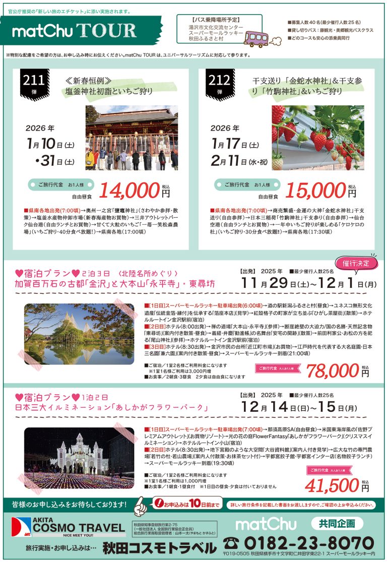 | 日程:令和8年1月10日(土)、31日(土) 集合場所:湯沢・十文字・横手 代金:旅行代金 おひとり様 大人 14,000円(税込) 旅行日程:県南各地→奥州一之宮「鹽竈神社」(さわやか参拝・散策)→塩釜水産物仲卸市場(新春海産物お買物)→三井アウトレットパーク仙台港(自由ランチとお買物)→甘くて大粒のいちご「一苺一笑松森農場」(いちご狩り・40分食べ放題)→県南各地 最低催行人数:40名 添乗員同行 ※内容は変わる場合がございますので、予めご了承ください。 |