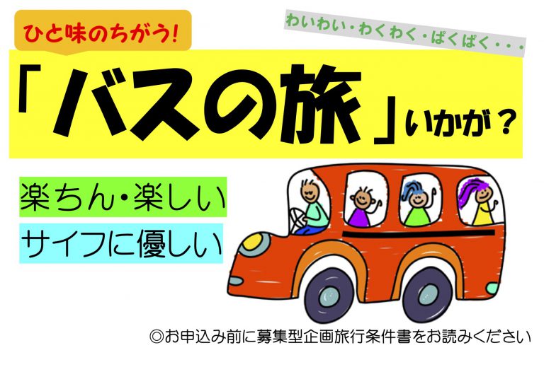 日帰りバス旅 募集人数40名(最少催行人数25名)どのコースも安心の添乗員同行 。